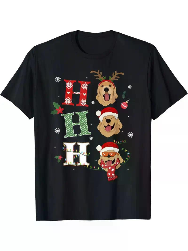 1pc Ho Ho Ho Golden Retrievers Christmas T-Shirt for Men, 100% Cotton Crew Neck Short Sleeve Tee, Geometric Pattern, All-Season Comfort
