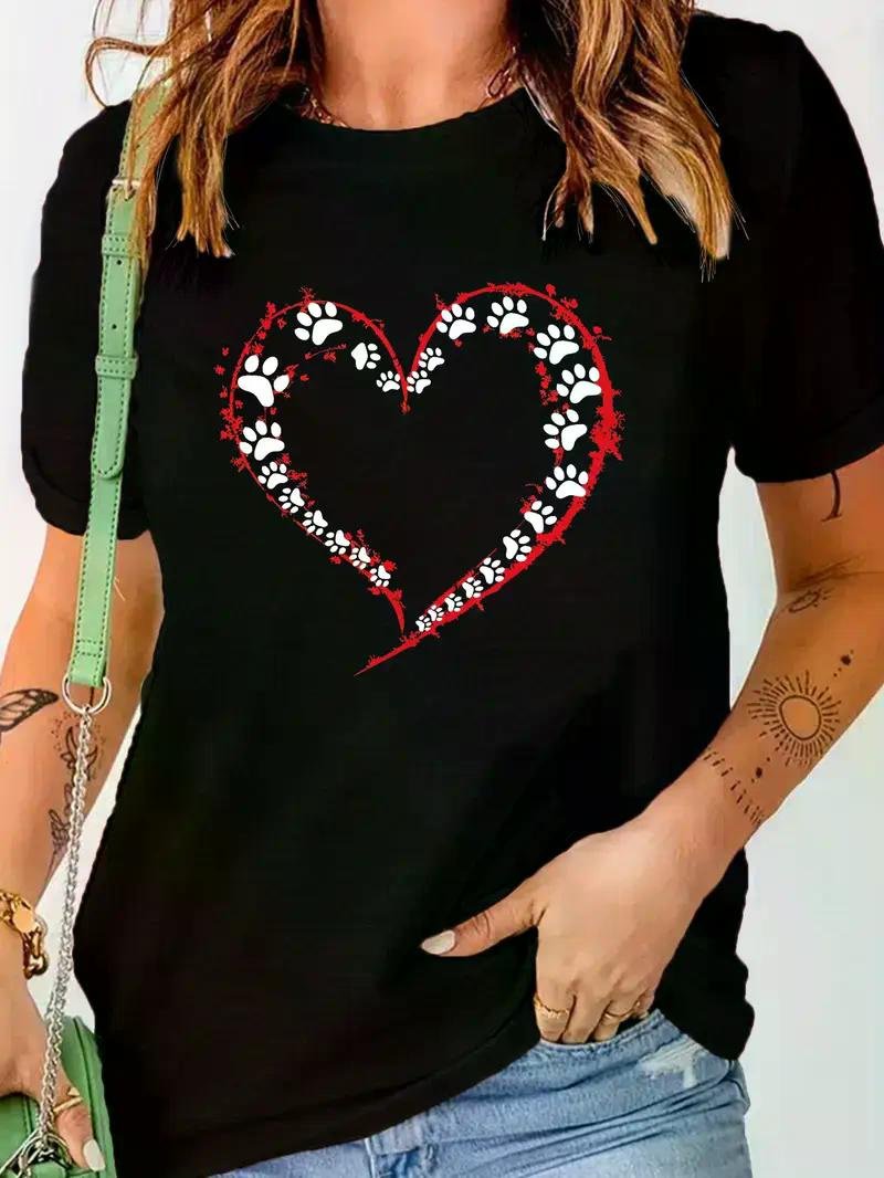 Women's 180g 100% Crew Neck T-Shirt - Casual Short Sleeve Summer Top with Heart & Paw Print Design, Machine Washable Regular Fit Tee for Pet Lovers