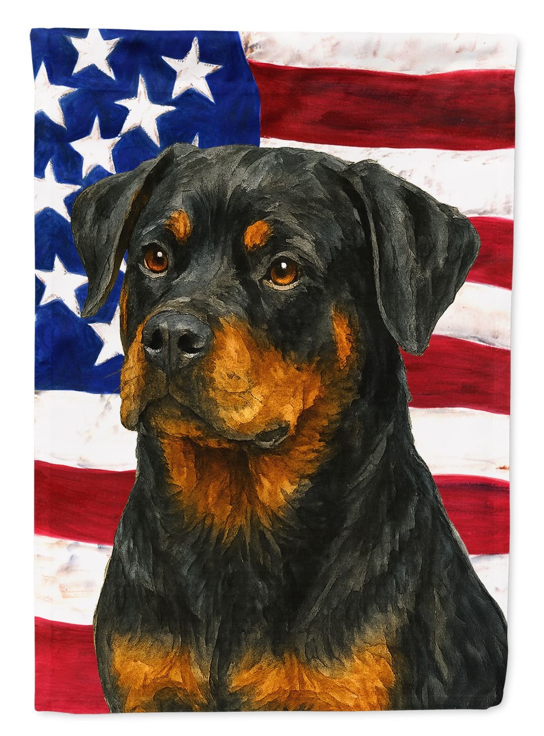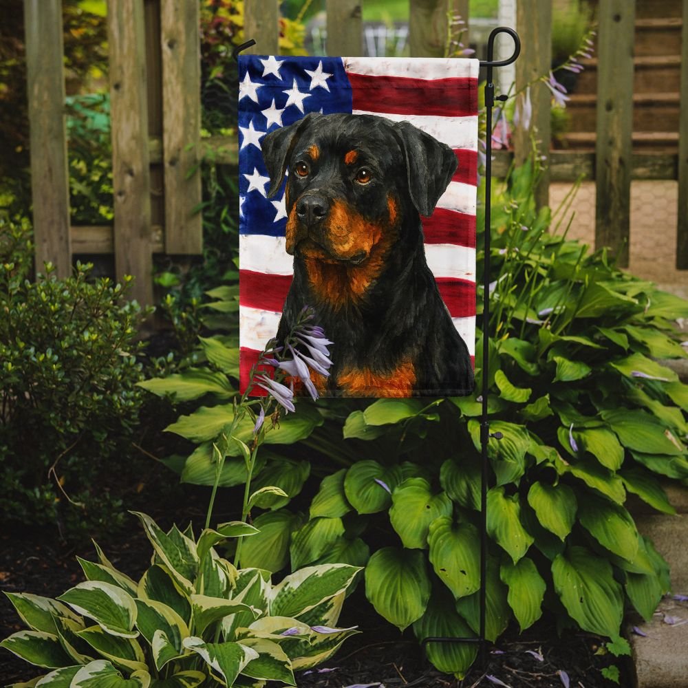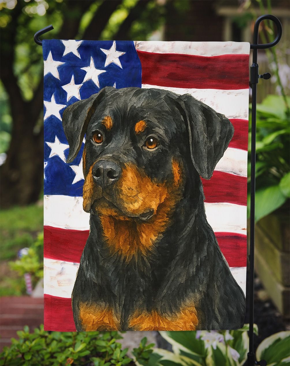 Garden Flag featuring breed specific Rottweiler artwork. Enhance the beauty of your garden, patio, or yard with Caroline's Treasures Decorative Garden Flag, proudly made in the USA. Crafted from two pieces of thick, double-sided polyester fabric, this 2-ply garden flag is designed to withstand various weather conditions, making it water-resistant and weatherproof. Featuring correctly readable words on both sides, this garden flag offers a delightful visual experience from any angle. With its heavier weight, it stands out among other garden flags, ensuring stability and durability even in wind, rain, and snow. Measuring approximately 11 1/4 inches by 15 1/2 inches, this flag allows you to personalize your outdoor decor. It comes with a 1 1/2-inch sleeve sewn in, allowing easy attachment to any standard garden flag stand or garden size porch hanger (sold separately). Make a statement in your outdoor space with Caroline's Treasures Decorative Garden Flag, a vibrant and high-quality flag that adds color and personality to your surroundings. Proudly made in the USA, it's a symbol of quality craftsmanship and attention to detail.