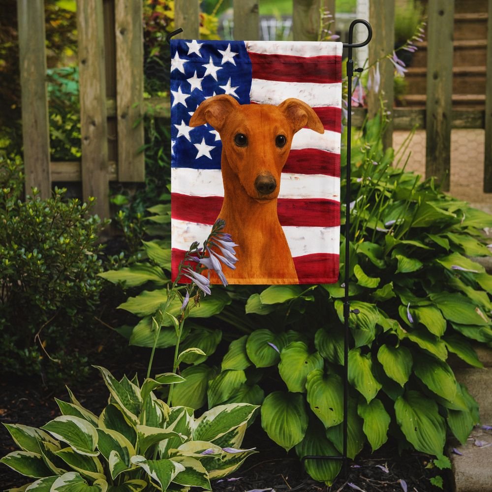 Garden Flag featuring breed specific Whippet artwork. Enhance the beauty of your garden, patio, or yard with Caroline's Treasures Decorative Garden Flag, proudly made in the USA. Crafted from two pieces of thick, double-sided polyester fabric, this 2-ply garden flag is designed to withstand various weather conditions, making it water-resistant and weatherproof. Featuring correctly readable words on both sides, this garden flag offers a delightful visual experience from any angle. With its heavier weight, it stands out among other garden flags, ensuring stability and durability even in wind, rain, and snow. Measuring approximately 11 1/4 inches by 15 1/2 inches, this flag allows you to personalize your outdoor decor. It comes with a 1 1/2-inch sleeve sewn in, allowing easy attachment to any standard garden flag stand or garden size porch hanger (sold separately). Make a statement in your outdoor space with Caroline's Treasures Decorative Garden Flag, a vibrant and high-quality flag that adds color and personality to your surroundings. Proudly made in the USA, it's a symbol of quality craftsmanship and attention to detail.