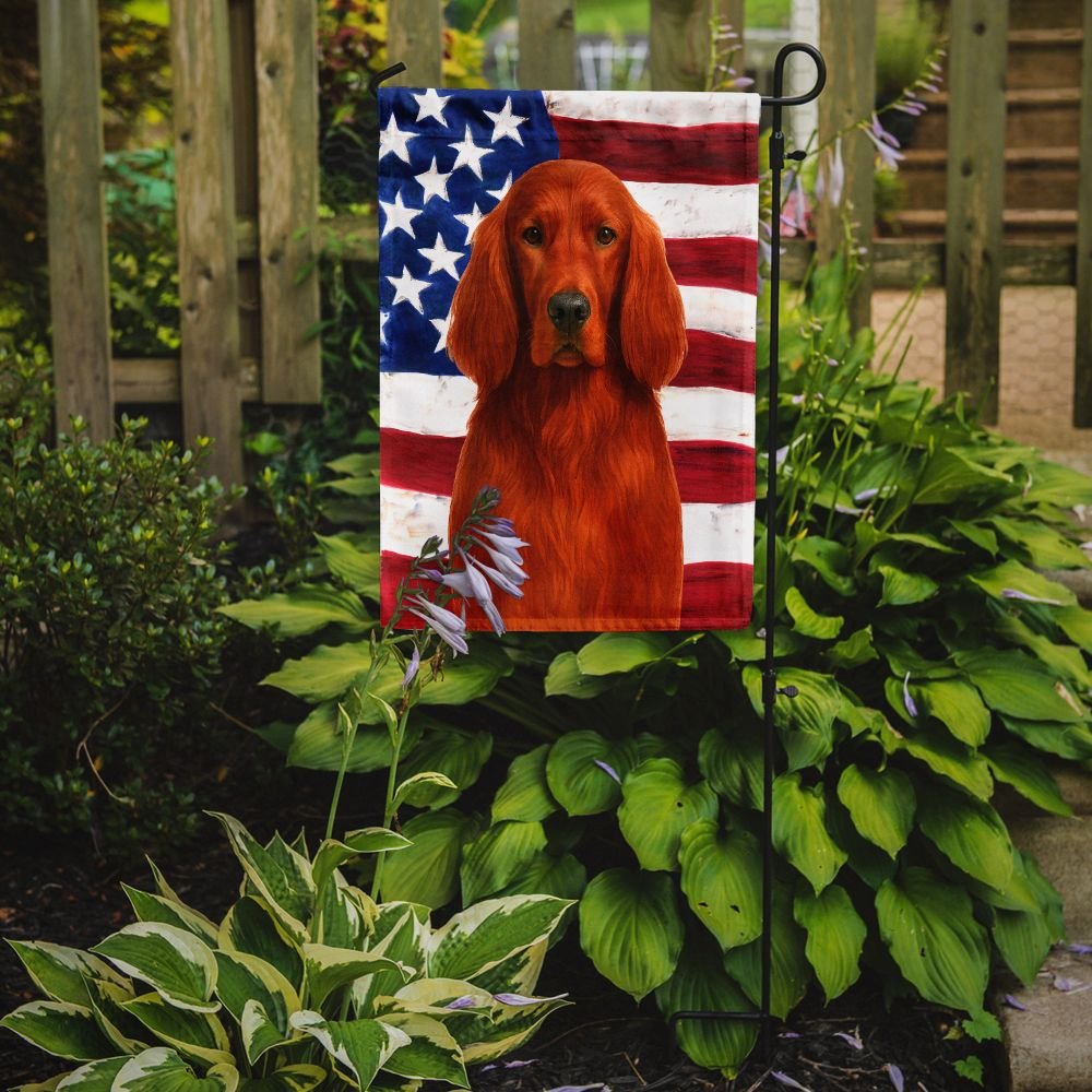 Garden Flag featuring breed specific Irish Setter artwork. Enhance the beauty of your garden, patio, or yard with Caroline's Treasures Decorative Garden Flag, proudly made in the USA. Crafted from two pieces of thick, double-sided polyester fabric, this 2-ply garden flag is designed to withstand various weather conditions, making it water-resistant and weatherproof. Featuring correctly readable words on both sides, this garden flag offers a delightful visual experience from any angle. With its heavier weight, it stands out among other garden flags, ensuring stability and durability even in wind, rain, and snow. Measuring approximately 11 1/4 inches by 15 1/2 inches, this flag allows you to personalize your outdoor decor. It comes with a 1 1/2-inch sleeve sewn in, allowing easy attachment to any standard garden flag stand or garden size porch hanger (sold separately). Make a statement in your outdoor space with Caroline's Treasures Decorative Garden Flag, a vibrant and high-quality flag that adds color and personality to your surroundings. Proudly made in the USA, it's a symbol of quality craftsmanship and attention to detail.