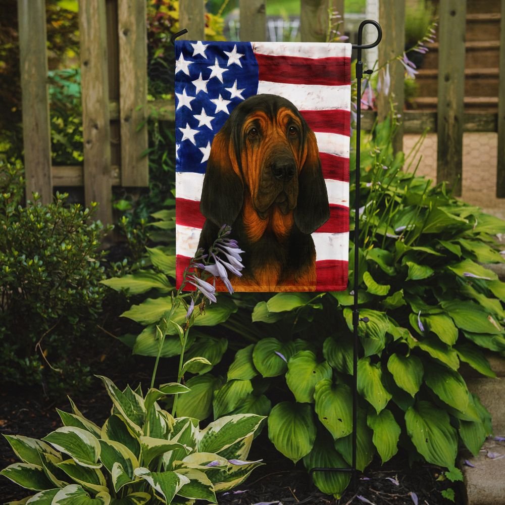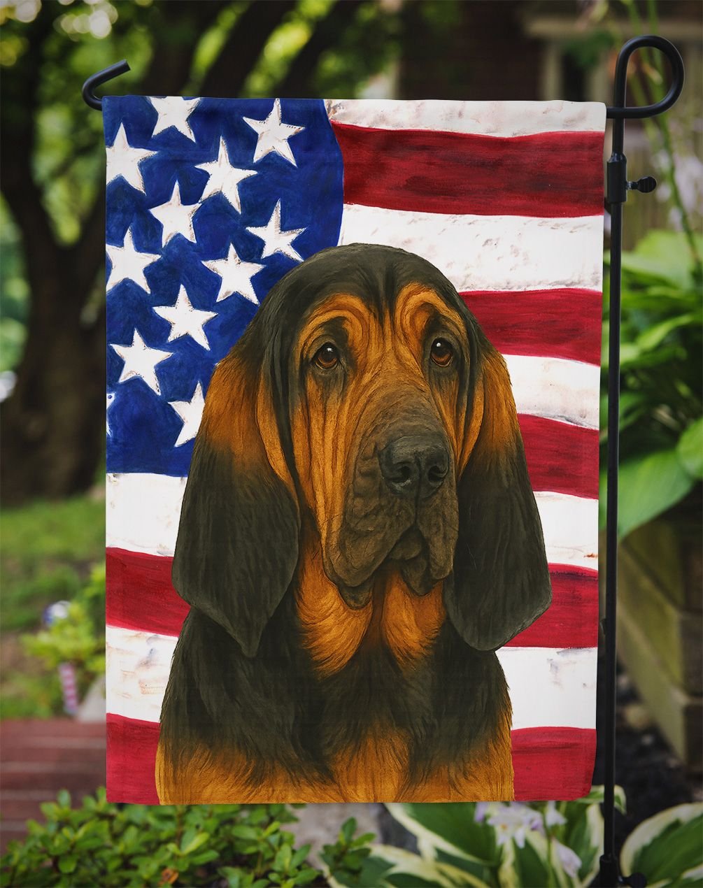 Garden Flag featuring breed specific Bloodhound artwork. Enhance the beauty of your garden, patio, or yard with Caroline's Treasures Decorative Garden Flag, proudly made in the USA. Crafted from two pieces of thick, double-sided polyester fabric, this 2-ply garden flag is designed to withstand various weather conditions, making it water-resistant and weatherproof. Featuring correctly readable words on both sides, this garden flag offers a delightful visual experience from any angle. With its heavier weight, it stands out among other garden flags, ensuring stability and durability even in wind, rain, and snow. Measuring approximately 11 1/4 inches by 15 1/2 inches, this flag allows you to personalize your outdoor decor. It comes with a 1 1/2-inch sleeve sewn in, allowing easy attachment to any standard garden flag stand or garden size porch hanger (sold separately). Make a statement in your outdoor space with Caroline's Treasures Decorative Garden Flag, a vibrant and high-quality flag that adds color and personality to your surroundings. Proudly made in the USA, it's a symbol of quality craftsmanship and attention to detail.