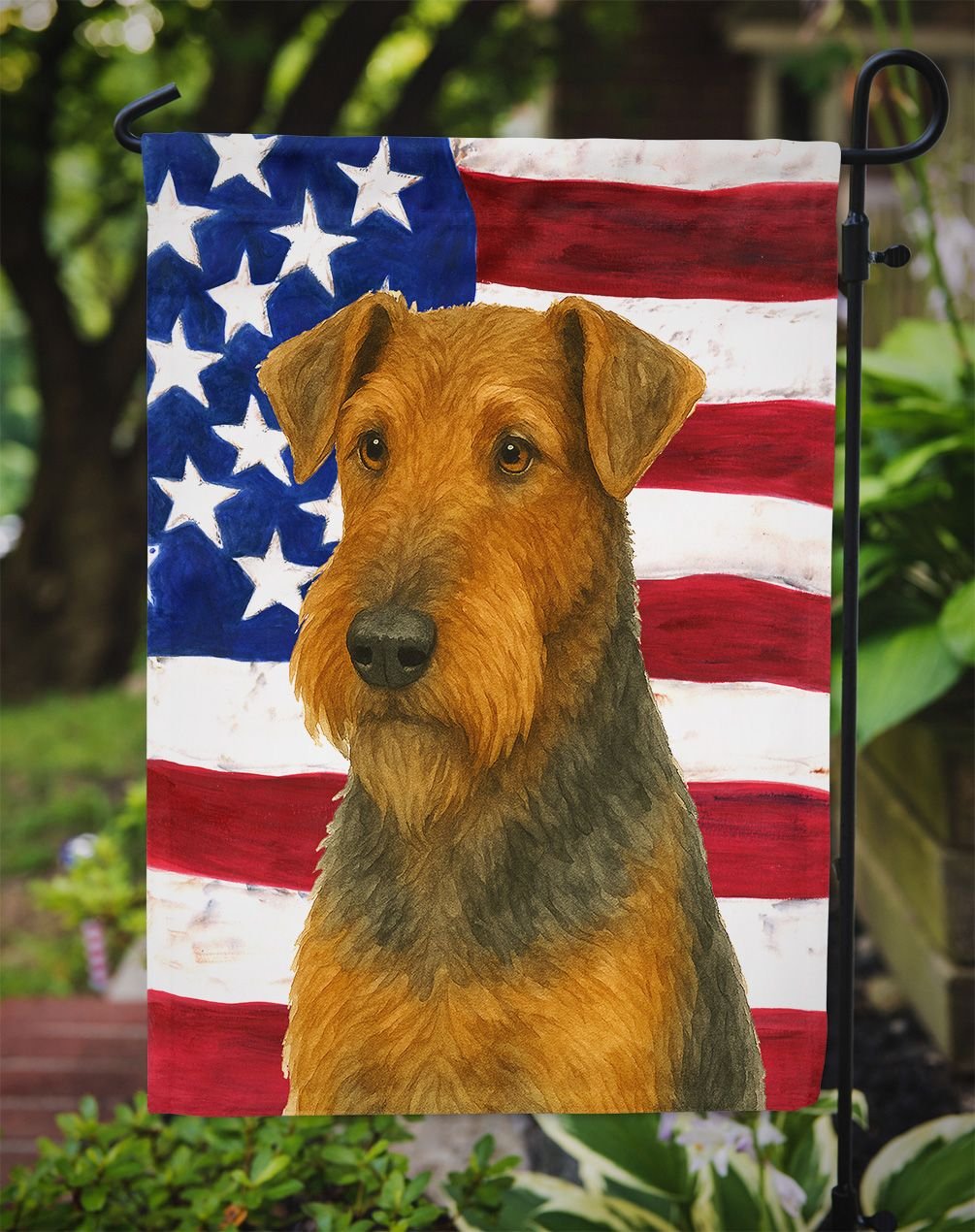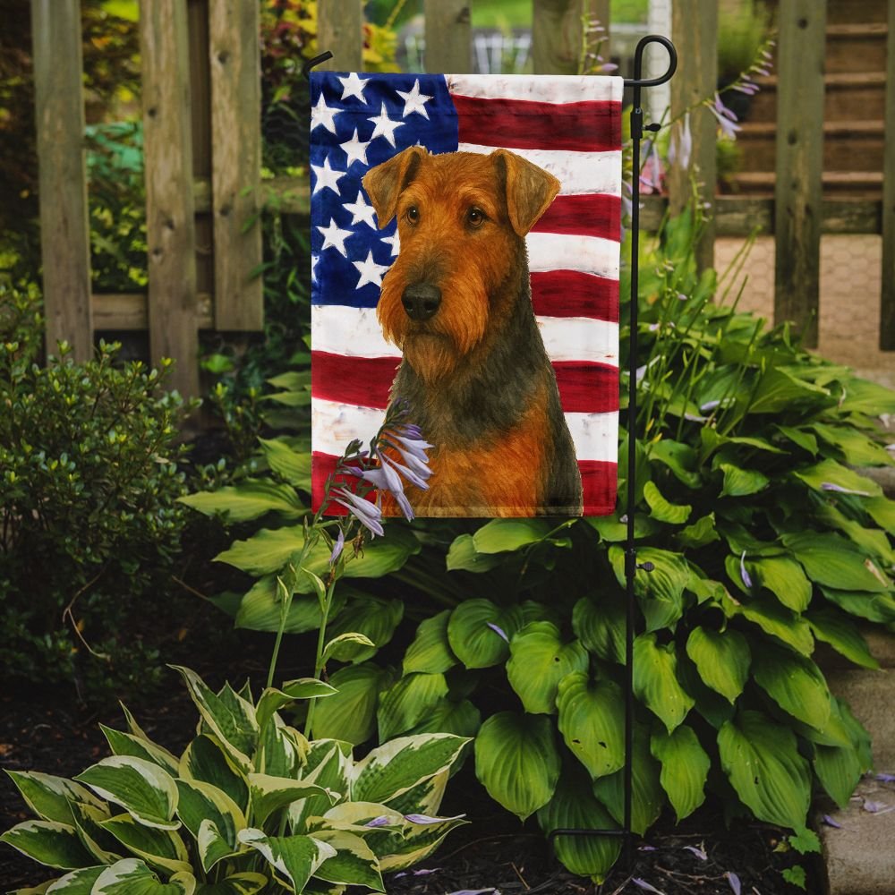 Garden Flag featuring breed specific Airedale Terrier artwork. Enhance the beauty of your garden, patio, or yard with Caroline's Treasures Decorative Garden Flag, proudly made in the USA. Crafted from two pieces of thick, double-sided polyester fabric, this 2-ply garden flag is designed to withstand various weather conditions, making it water-resistant and weatherproof. Featuring correctly readable words on both sides, this garden flag offers a delightful visual experience from any angle. With its heavier weight, it stands out among other garden flags, ensuring stability and durability even in wind, rain, and snow. Measuring approximately 11 1/4 inches by 15 1/2 inches, this flag allows you to personalize your outdoor decor. It comes with a 1 1/2-inch sleeve sewn in, allowing easy attachment to any standard garden flag stand or garden size porch hanger (sold separately). Make a statement in your outdoor space with Caroline's Treasures Decorative Garden Flag, a vibrant and high-quality flag that adds color and personality to your surroundings. Proudly made in the USA, it's a symbol of quality craftsmanship and attention to detail.