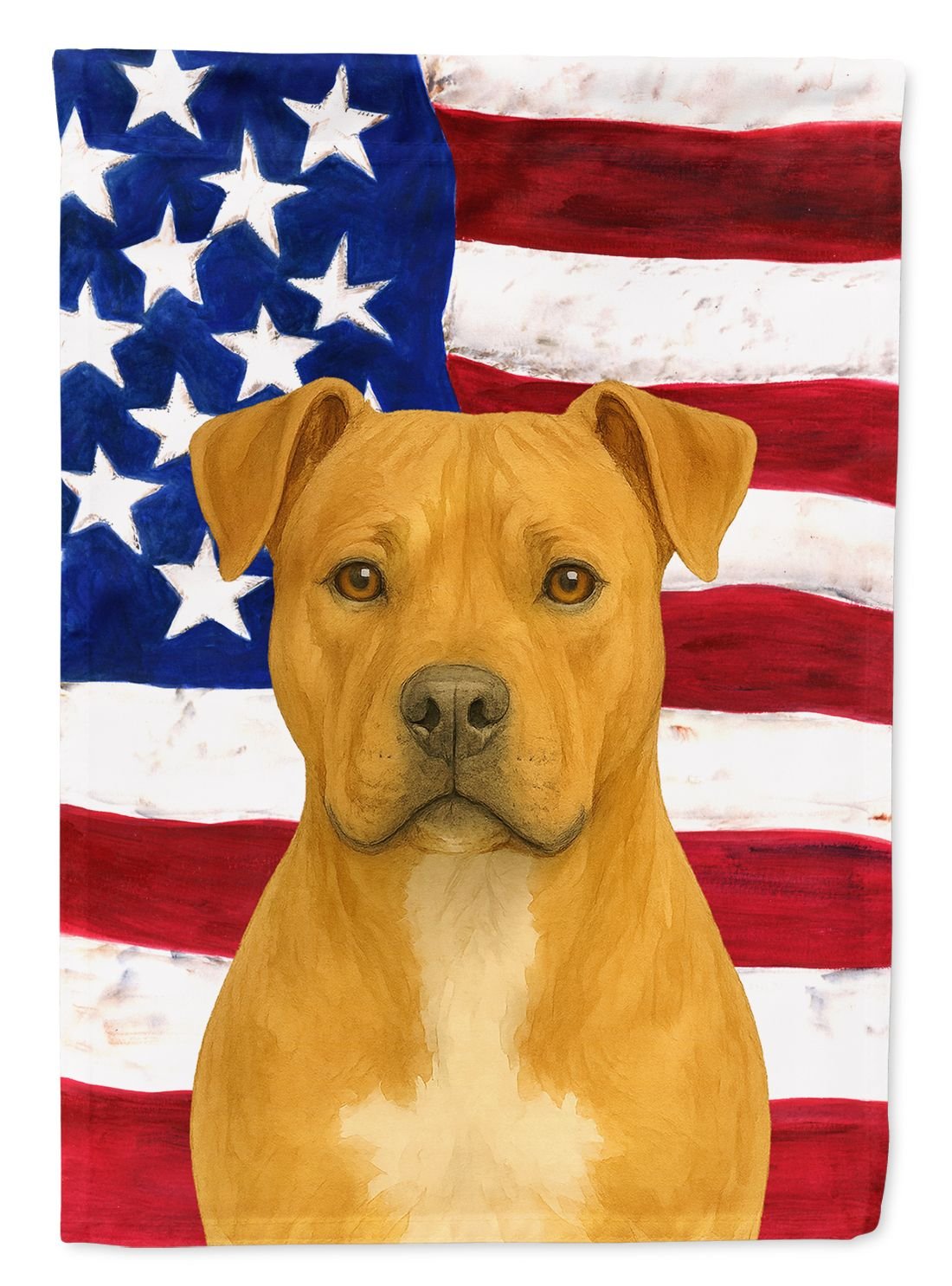 Garden Flag featuring breed specific American Staffordshire Terrier artwork. Enhance the beauty of your garden, patio, or yard with Caroline's Treasures Decorative Garden Flag, proudly made in the USA. Crafted from two pieces of thick, double-sided polyester fabric, this 2-ply garden flag is designed to withstand various weather conditions, making it water-resistant and weatherproof. Featuring correctly readable words on both sides, this garden flag offers a delightful visual experience from any angle. With its heavier weight, it stands out among other garden flags, ensuring stability and durability even in wind, rain, and snow. Measuring approximately 11 1/4 inches by 15 1/2 inches, this flag allows you to personalize your outdoor decor. It comes with a 1 1/2-inch sleeve sewn in, allowing easy attachment to any standard garden flag stand or garden size porch hanger (sold separately). Make a statement in your outdoor space with Caroline's Treasures Decorative Garden Flag, a vibrant and high-quality flag that adds color and personality to your surroundings. Proudly made in the USA, it's a symbol of quality craftsmanship and attention to detail.