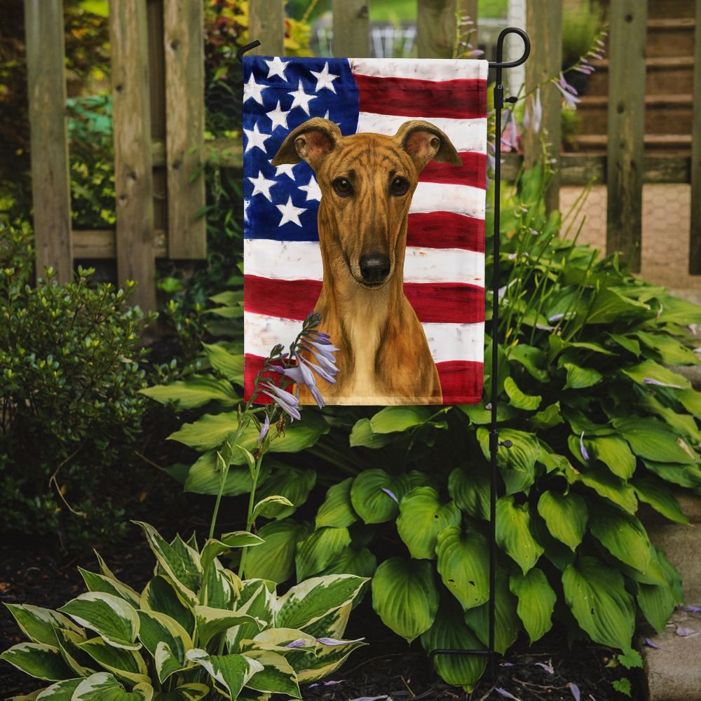 Garden Flag featuring breed specific Greyhound artwork. Enhance the beauty of your garden, patio, or yard with Caroline's Treasures Decorative Garden Flag, proudly made in the USA. Crafted from two pieces of thick, double-sided polyester fabric, this 2-ply garden flag is designed to withstand various weather conditions, making it water-resistant and weatherproof. Featuring correctly readable words on both sides, this garden flag offers a delightful visual experience from any angle. With its heavier weight, it stands out among other garden flags, ensuring stability and durability even in wind, rain, and snow. Measuring approximately 11 1/4 inches by 15 1/2 inches, this flag allows you to personalize your outdoor decor. It comes with a 1 1/2-inch sleeve sewn in, allowing easy attachment to any standard garden flag stand or garden size porch hanger (sold separately). Make a statement in your outdoor space with Caroline's Treasures Decorative Garden Flag, a vibrant and high-quality flag that adds color and personality to your surroundings. Proudly made in the USA, it's a symbol of quality craftsmanship and attention to detail.