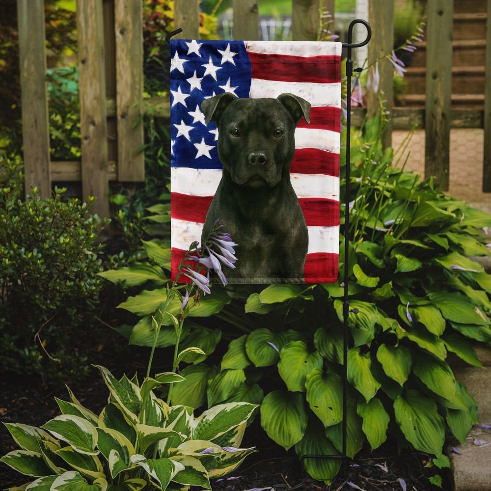 Garden Flag featuring breed specific American Staffordshire Terrier artwork. Enhance the beauty of your garden, patio, or yard with Caroline's Treasures Decorative Garden Flag, proudly made in the USA. Crafted from two pieces of thick, double-sided polyester fabric, this 2-ply garden flag is designed to withstand various weather conditions, making it water-resistant and weatherproof. Featuring correctly readable words on both sides, this garden flag offers a delightful visual experience from any angle. With its heavier weight, it stands out among other garden flags, ensuring stability and durability even in wind, rain, and snow. Measuring approximately 11 1/4 inches by 15 1/2 inches, this flag allows you to personalize your outdoor decor. It comes with a 1 1/2-inch sleeve sewn in, allowing easy attachment to any standard garden flag stand or garden size porch hanger (sold separately). Make a statement in your outdoor space with Caroline's Treasures Decorative Garden Flag, a vibrant and high-quality flag that adds color and personality to your surroundings. Proudly made in the USA, it's a symbol of quality craftsmanship and attention to detail.