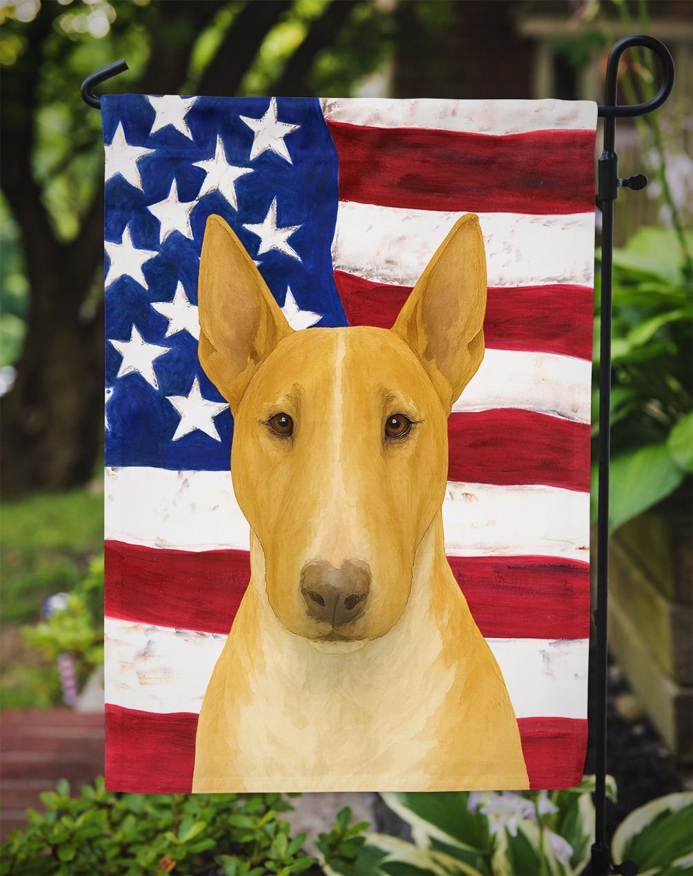 Garden Flag featuring breed specific Bull Terrier artwork. Enhance the beauty of your garden, patio, or yard with Caroline's Treasures Decorative Garden Flag, proudly made in the USA. Crafted from two pieces of thick, double-sided polyester fabric, this 2-ply garden flag is designed to withstand various weather conditions, making it water-resistant and weatherproof. Featuring correctly readable words on both sides, this garden flag offers a delightful visual experience from any angle. With its heavier weight, it stands out among other garden flags, ensuring stability and durability even in wind, rain, and snow. Measuring approximately 11 1/4 inches by 15 1/2 inches, this flag allows you to personalize your outdoor decor. It comes with a 1 1/2-inch sleeve sewn in, allowing easy attachment to any standard garden flag stand or garden size porch hanger (sold separately). Make a statement in your outdoor space with Caroline's Treasures Decorative Garden Flag, a vibrant and high-quality flag that adds color and personality to your surroundings. Proudly made in the USA, it's a symbol of quality craftsmanship and attention to detail.