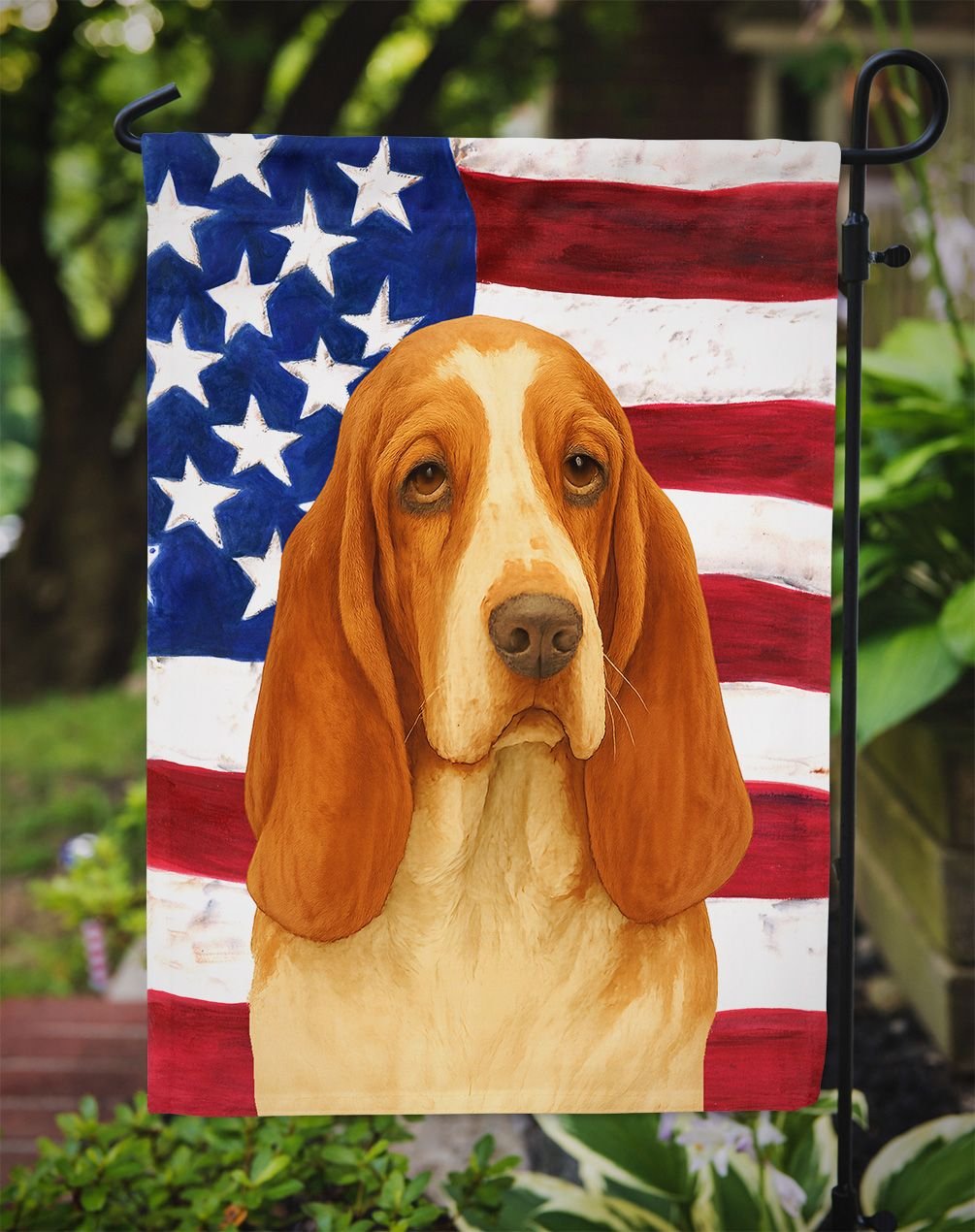 Garden Flag featuring breed specific Basset Hound artwork. Enhance the beauty of your garden, patio, or yard with Caroline's Treasures Decorative Garden Flag, proudly made in the USA. Crafted from two pieces of thick, double-sided polyester fabric, this 2-ply garden flag is designed to withstand various weather conditions, making it water-resistant and weatherproof. Featuring correctly readable words on both sides, this garden flag offers a delightful visual experience from any angle. With its heavier weight, it stands out among other garden flags, ensuring stability and durability even in wind, rain, and snow. Measuring approximately 11 1/4 inches by 15 1/2 inches, this flag allows you to personalize your outdoor decor. It comes with a 1 1/2-inch sleeve sewn in, allowing easy attachment to any standard garden flag stand or garden size porch hanger (sold separately). Make a statement in your outdoor space with Caroline's Treasures Decorative Garden Flag, a vibrant and high-quality flag that adds color and personality to your surroundings. Proudly made in the USA, it's a symbol of quality craftsmanship and attention to detail.