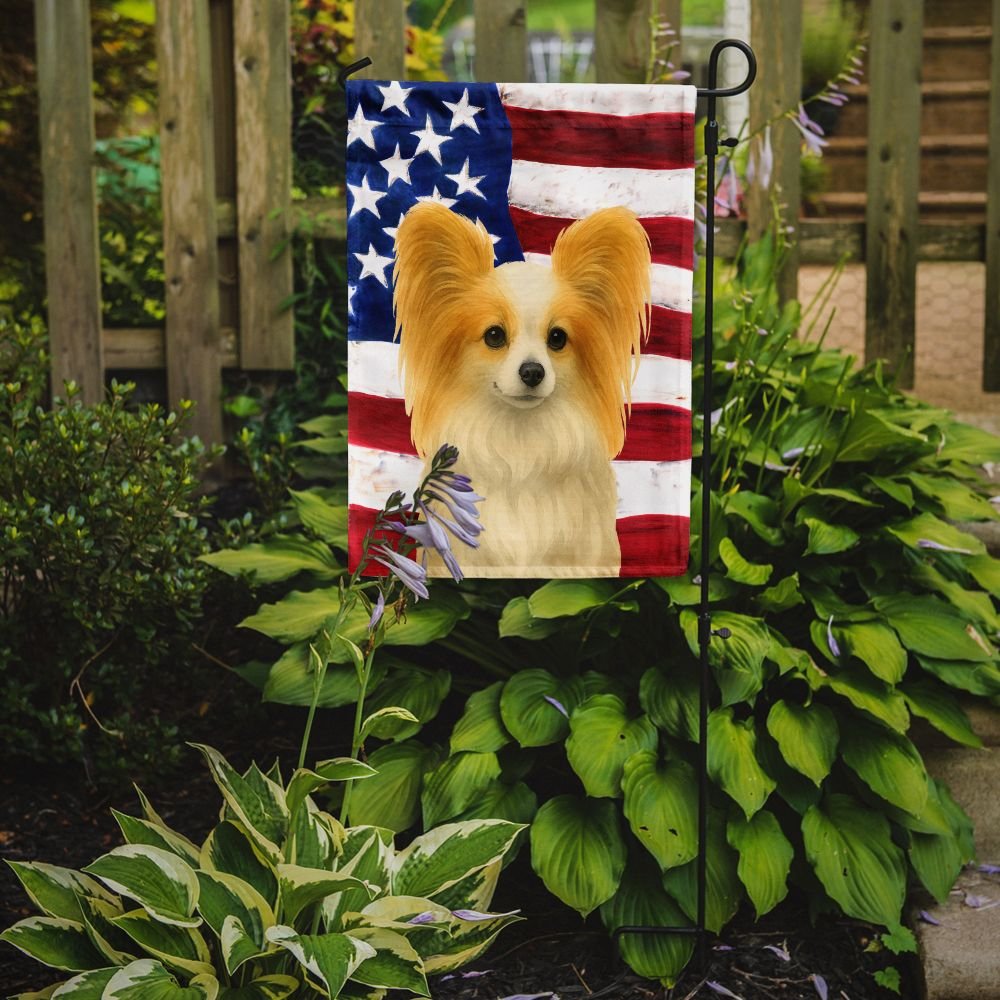 Garden Flag featuring breed specific Papillon artwork. Enhance the beauty of your garden, patio, or yard with Caroline's Treasures Decorative Garden Flag, proudly made in the USA. Crafted from two pieces of thick, double-sided polyester fabric, this 2-ply garden flag is designed to withstand various weather conditions, making it water-resistant and weatherproof. Featuring correctly readable words on both sides, this garden flag offers a delightful visual experience from any angle. With its heavier weight, it stands out among other garden flags, ensuring stability and durability even in wind, rain, and snow. Measuring approximately 11 1/4 inches by 15 1/2 inches, this flag allows you to personalize your outdoor decor. It comes with a 1 1/2-inch sleeve sewn in, allowing easy attachment to any standard garden flag stand or garden size porch hanger (sold separately). Make a statement in your outdoor space with Caroline's Treasures Decorative Garden Flag, a vibrant and high-quality flag that adds color and personality to your surroundings. Proudly made in the USA, it's a symbol of quality craftsmanship and attention to detail.