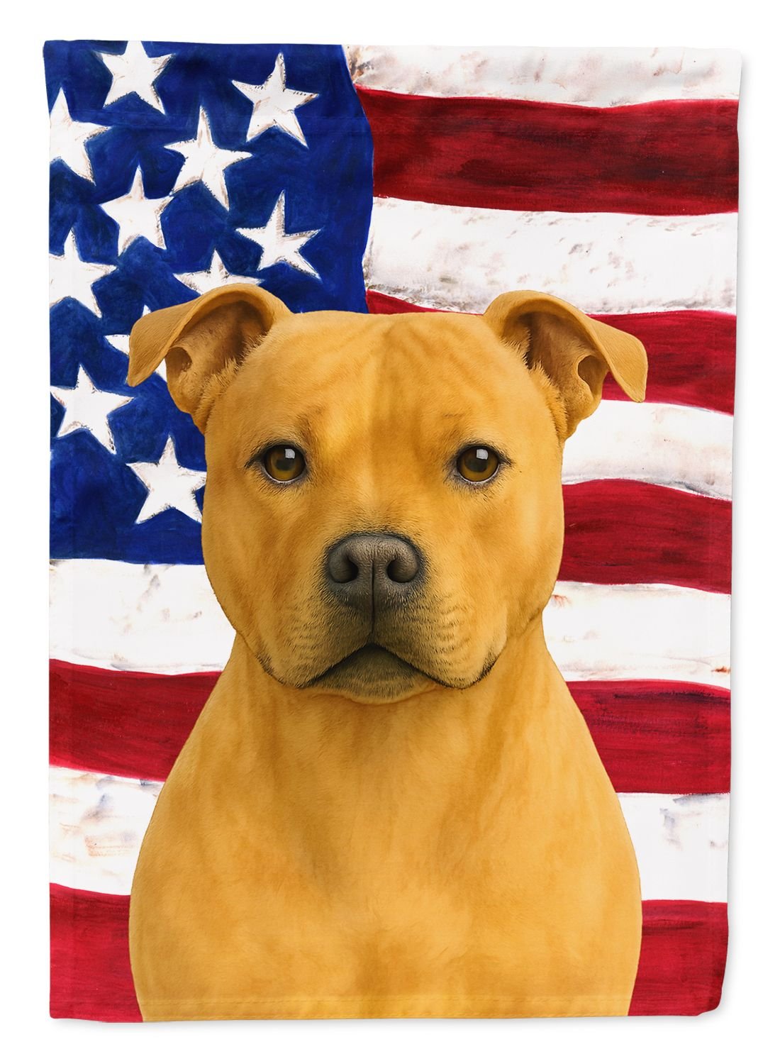 Garden Flag featuring breed specific Staffordshire Bull Terrier artwork. Enhance the beauty of your garden, patio, or yard with Caroline's Treasures Decorative Garden Flag, proudly made in the USA. Crafted from two pieces of thick, double-sided polyester fabric, this 2-ply garden flag is designed to withstand various weather conditions, making it water-resistant and weatherproof. Featuring correctly readable words on both sides, this garden flag offers a delightful visual experience from any angle. With its heavier weight, it stands out among other garden flags, ensuring stability and durability even in wind, rain, and snow. Measuring approximately 11 1/4 inches by 15 1/2 inches, this flag allows you to personalize your outdoor decor. It comes with a 1 1/2-inch sleeve sewn in, allowing easy attachment to any standard garden flag stand or garden size porch hanger (sold separately). Make a statement in your outdoor space with Caroline's Treasures Decorative Garden Flag, a vibrant and high-quality flag that adds color and personality to your surroundings. Proudly made in the USA, it's a symbol of quality craftsmanship and attention to detail.
