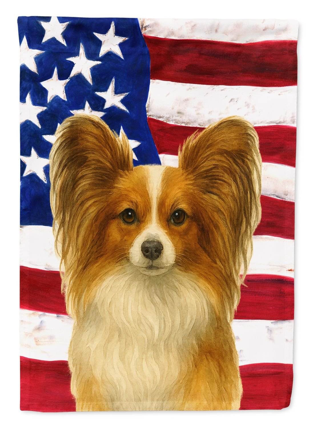 Garden Flag featuring breed specific Papillon artwork. Enhance the beauty of your garden, patio, or yard with Caroline's Treasures Decorative Garden Flag, proudly made in the USA. Crafted from two pieces of thick, double-sided polyester fabric, this 2-ply garden flag is designed to withstand various weather conditions, making it water-resistant and weatherproof. Featuring correctly readable words on both sides, this garden flag offers a delightful visual experience from any angle. With its heavier weight, it stands out among other garden flags, ensuring stability and durability even in wind, rain, and snow. Measuring approximately 11 1/4 inches by 15 1/2 inches, this flag allows you to personalize your outdoor decor. It comes with a 1 1/2-inch sleeve sewn in, allowing easy attachment to any standard garden flag stand or garden size porch hanger (sold separately). Make a statement in your outdoor space with Caroline's Treasures Decorative Garden Flag, a vibrant and high-quality flag that adds color and personality to your surroundings. Proudly made in the USA, it's a symbol of quality craftsmanship and attention to detail.
