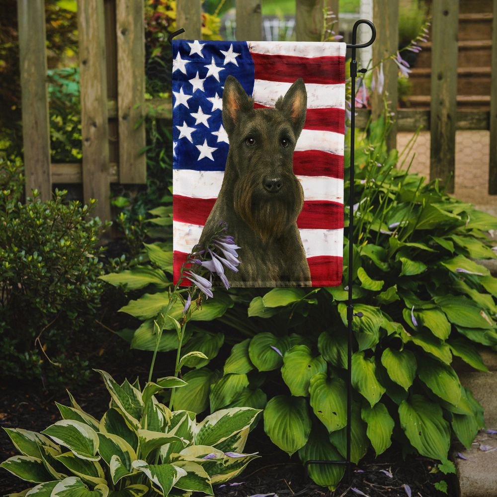 Garden Flag featuring breed specific Scottish Terrier artwork. Enhance the beauty of your garden, patio, or yard with Caroline's Treasures Decorative Garden Flag, proudly made in the USA. Crafted from two pieces of thick, double-sided polyester fabric, this 2-ply garden flag is designed to withstand various weather conditions, making it water-resistant and weatherproof. Featuring correctly readable words on both sides, this garden flag offers a delightful visual experience from any angle. With its heavier weight, it stands out among other garden flags, ensuring stability and durability even in wind, rain, and snow. Measuring approximately 11 1/4 inches by 15 1/2 inches, this flag allows you to personalize your outdoor decor. It comes with a 1 1/2-inch sleeve sewn in, allowing easy attachment to any standard garden flag stand or garden size porch hanger (sold separately). Make a statement in your outdoor space with Caroline's Treasures Decorative Garden Flag, a vibrant and high-quality flag that adds color and personality to your surroundings. Proudly made in the USA, it's a symbol of quality craftsmanship and attention to detail.