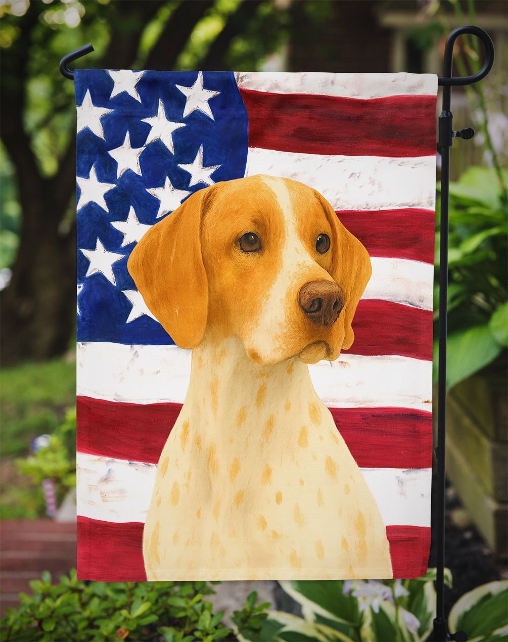 Garden Flag featuring breed specific Pointer artwork. Enhance the beauty of your garden, patio, or yard with Caroline's Treasures Decorative Garden Flag, proudly made in the USA. Crafted from two pieces of thick, double-sided polyester fabric, this 2-ply garden flag is designed to withstand various weather conditions, making it water-resistant and weatherproof. Featuring correctly readable words on both sides, this garden flag offers a delightful visual experience from any angle. With its heavier weight, it stands out among other garden flags, ensuring stability and durability even in wind, rain, and snow. Measuring approximately 11 1/4 inches by 15 1/2 inches, this flag allows you to personalize your outdoor decor. It comes with a 1 1/2-inch sleeve sewn in, allowing easy attachment to any standard garden flag stand or garden size porch hanger (sold separately). Make a statement in your outdoor space with Caroline's Treasures Decorative Garden Flag, a vibrant and high-quality flag that adds color and personality to your surroundings. Proudly made in the USA, it's a symbol of quality craftsmanship and attention to detail.