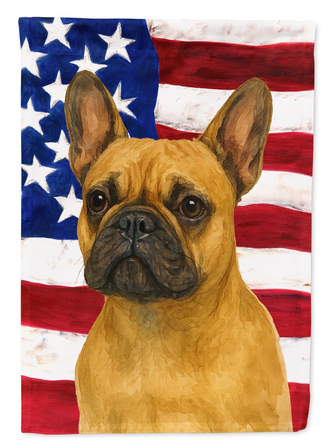 Garden Flag featuring breed specific French Bulldog artwork. Enhance the beauty of your garden, patio, or yard with Caroline's Treasures Decorative Garden Flag, proudly made in the USA. Crafted from two pieces of thick, double-sided polyester fabric, this 2-ply garden flag is designed to withstand various weather conditions, making it water-resistant and weatherproof. Featuring correctly readable words on both sides, this garden flag offers a delightful visual experience from any angle. With its heavier weight, it stands out among other garden flags, ensuring stability and durability even in wind, rain, and snow. Measuring approximately 11 1/4 inches by 15 1/2 inches, this flag allows you to personalize your outdoor decor. It comes with a 1 1/2-inch sleeve sewn in, allowing easy attachment to any standard garden flag stand or garden size porch hanger (sold separately). Make a statement in your outdoor space with Caroline's Treasures Decorative Garden Flag, a vibrant and high-quality flag that adds color and personality to your surroundings. Proudly made in the USA, it's a symbol of quality craftsmanship and attention to detail.
