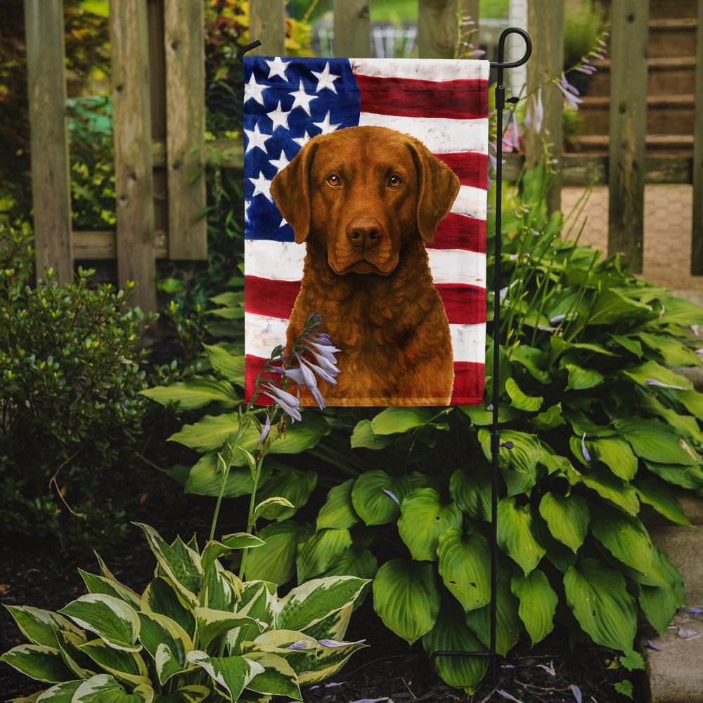 Garden Flag featuring breed specific Chesapeake Bay Retriever artwork. Enhance the beauty of your garden, patio, or yard with Caroline's Treasures Decorative Garden Flag, proudly made in the USA. Crafted from two pieces of thick, double-sided polyester fabric, this 2-ply garden flag is designed to withstand various weather conditions, making it water-resistant and weatherproof. Featuring correctly readable words on both sides, this garden flag offers a delightful visual experience from any angle. With its heavier weight, it stands out among other garden flags, ensuring stability and durability even in wind, rain, and snow. Measuring approximately 11 1/4 inches by 15 1/2 inches, this flag allows you to personalize your outdoor decor. It comes with a 1 1/2-inch sleeve sewn in, allowing easy attachment to any standard garden flag stand or garden size porch hanger (sold separately). Make a statement in your outdoor space with Caroline's Treasures Decorative Garden Flag, a vibrant and high-quality flag that adds color and personality to your surroundings. Proudly made in the USA, it's a symbol of quality craftsmanship and attention to detail.