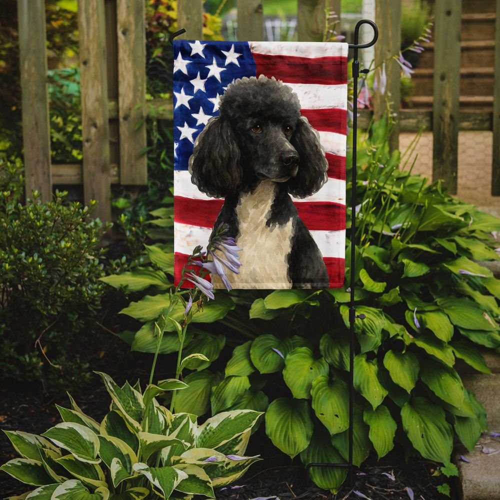 Garden Flag featuring breed specific Poodle artwork. Enhance the beauty of your garden, patio, or yard with Caroline's Treasures Decorative Garden Flag, proudly made in the USA. Crafted from two pieces of thick, double-sided polyester fabric, this 2-ply garden flag is designed to withstand various weather conditions, making it water-resistant and weatherproof. Featuring correctly readable words on both sides, this garden flag offers a delightful visual experience from any angle. With its heavier weight, it stands out among other garden flags, ensuring stability and durability even in wind, rain, and snow. Measuring approximately 11 1/4 inches by 15 1/2 inches, this flag allows you to personalize your outdoor decor. It comes with a 1 1/2-inch sleeve sewn in, allowing easy attachment to any standard garden flag stand or garden size porch hanger (sold separately). Make a statement in your outdoor space with Caroline's Treasures Decorative Garden Flag, a vibrant and high-quality flag that adds color and personality to your surroundings. Proudly made in the USA, it's a symbol of quality craftsmanship and attention to detail.