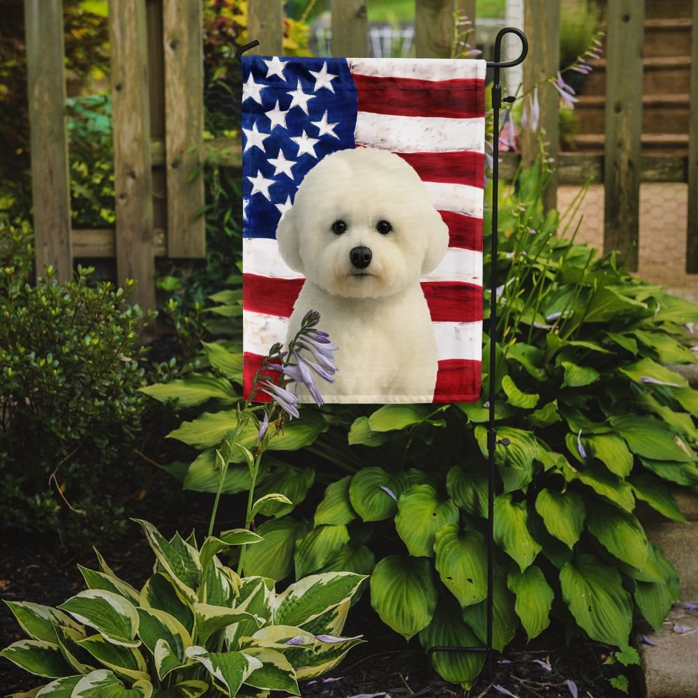Garden Flag featuring breed specific Bichon Frise artwork. Enhance the beauty of your garden, patio, or yard with Caroline's Treasures Decorative Garden Flag, proudly made in the USA. Crafted from two pieces of thick, double-sided polyester fabric, this 2-ply garden flag is designed to withstand various weather conditions, making it water-resistant and weatherproof. Featuring correctly readable words on both sides, this garden flag offers a delightful visual experience from any angle. With its heavier weight, it stands out among other garden flags, ensuring stability and durability even in wind, rain, and snow. Measuring approximately 11 1/4 inches by 15 1/2 inches, this flag allows you to personalize your outdoor decor. It comes with a 1 1/2-inch sleeve sewn in, allowing easy attachment to any standard garden flag stand or garden size porch hanger (sold separately). Make a statement in your outdoor space with Caroline's Treasures Decorative Garden Flag, a vibrant and high-quality flag that adds color and personality to your surroundings. Proudly made in the USA, it's a symbol of quality craftsmanship and attention to detail.