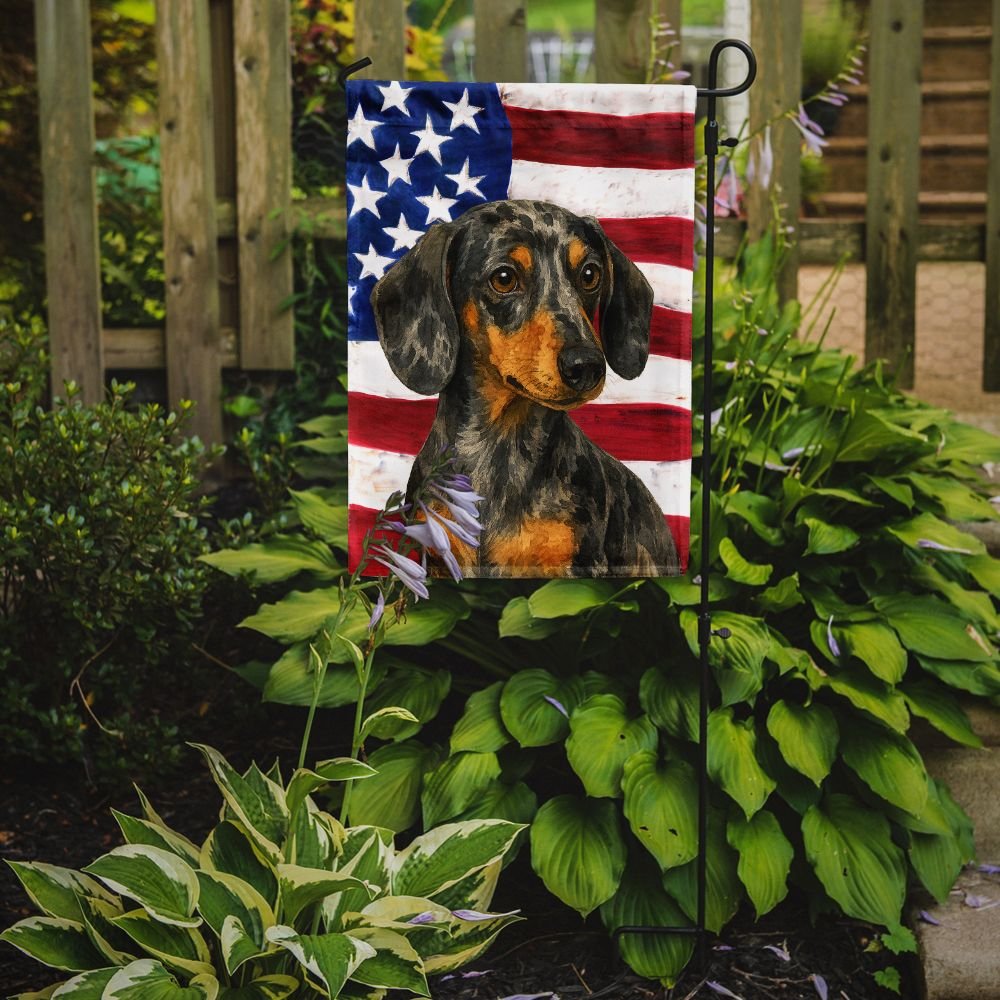 Garden Flag featuring breed specific Dachshund artwork. Enhance the beauty of your garden, patio, or yard with Caroline's Treasures Decorative Garden Flag, proudly made in the USA. Crafted from two pieces of thick, double-sided polyester fabric, this 2-ply garden flag is designed to withstand various weather conditions, making it water-resistant and weatherproof. Featuring correctly readable words on both sides, this garden flag offers a delightful visual experience from any angle. With its heavier weight, it stands out among other garden flags, ensuring stability and durability even in wind, rain, and snow. Measuring approximately 11 1/4 inches by 15 1/2 inches, this flag allows you to personalize your outdoor decor. It comes with a 1 1/2-inch sleeve sewn in, allowing easy attachment to any standard garden flag stand or garden size porch hanger (sold separately). Make a statement in your outdoor space with Caroline's Treasures Decorative Garden Flag, a vibrant and high-quality flag that adds color and personality to your surroundings. Proudly made in the USA, it's a symbol of quality craftsmanship and attention to detail.
