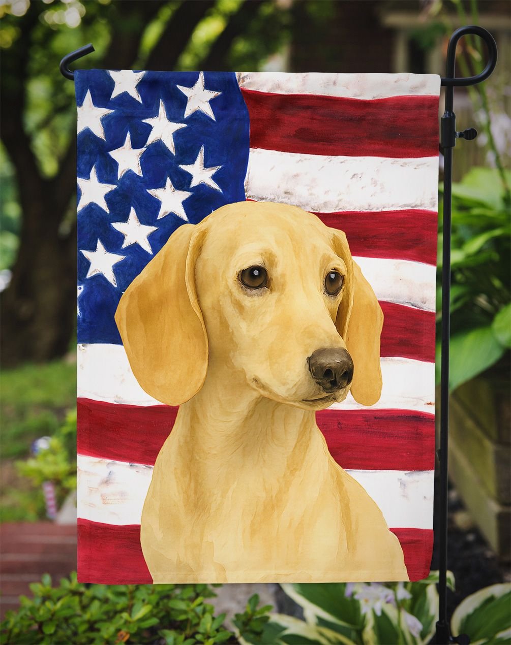 Garden Flag featuring breed specific Dachshund artwork. Enhance the beauty of your garden, patio, or yard with Caroline's Treasures Decorative Garden Flag, proudly made in the USA. Crafted from two pieces of thick, double-sided polyester fabric, this 2-ply garden flag is designed to withstand various weather conditions, making it water-resistant and weatherproof. Featuring correctly readable words on both sides, this garden flag offers a delightful visual experience from any angle. With its heavier weight, it stands out among other garden flags, ensuring stability and durability even in wind, rain, and snow. Measuring approximately 11 1/4 inches by 15 1/2 inches, this flag allows you to personalize your outdoor decor. It comes with a 1 1/2-inch sleeve sewn in, allowing easy attachment to any standard garden flag stand or garden size porch hanger (sold separately). Make a statement in your outdoor space with Caroline's Treasures Decorative Garden Flag, a vibrant and high-quality flag that adds color and personality to your surroundings. Proudly made in the USA, it's a symbol of quality craftsmanship and attention to detail.