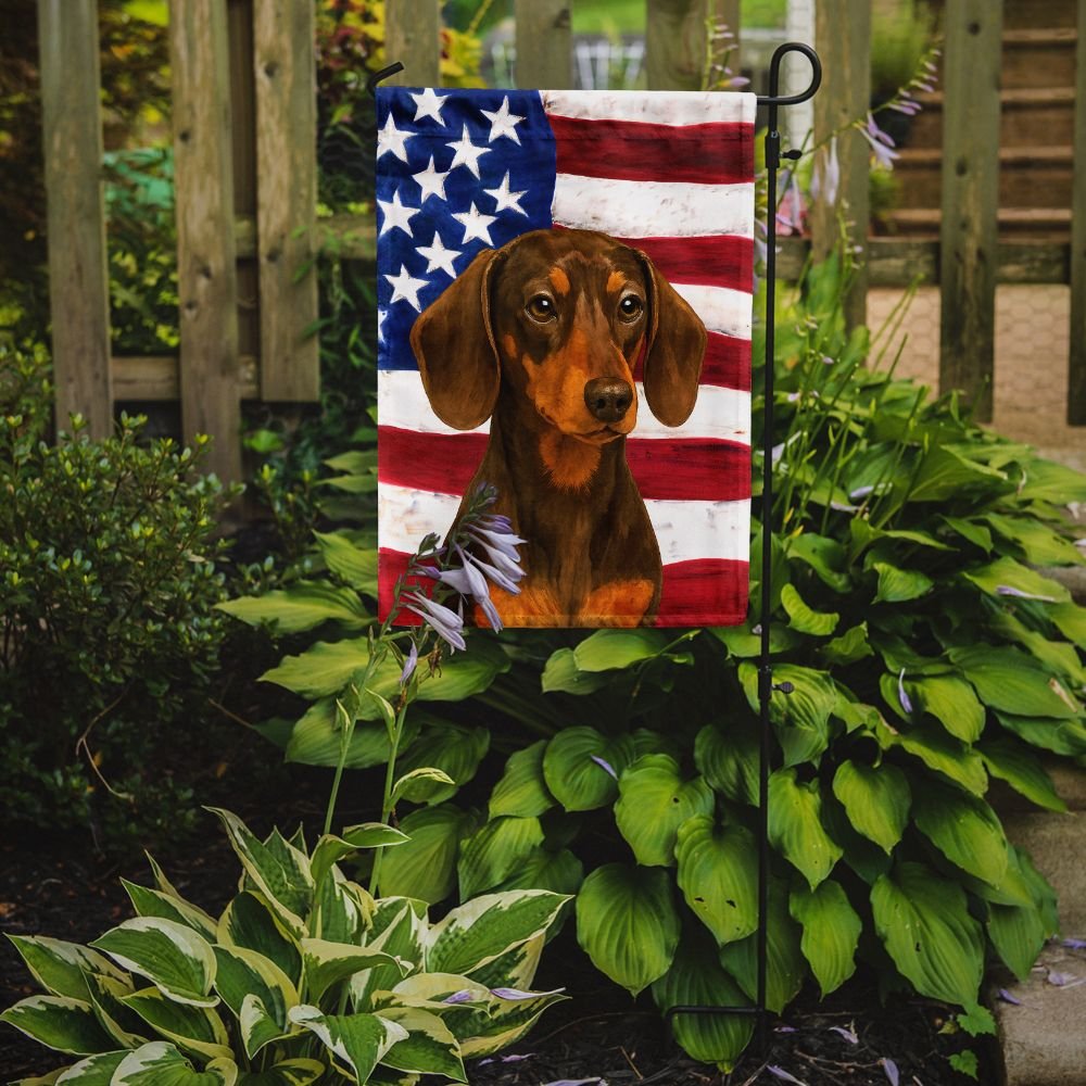 Garden Flag featuring breed specific Dachshund artwork. Enhance the beauty of your garden, patio, or yard with Caroline's Treasures Decorative Garden Flag, proudly made in the USA. Crafted from two pieces of thick, double-sided polyester fabric, this 2-ply garden flag is designed to withstand various weather conditions, making it water-resistant and weatherproof. Featuring correctly readable words on both sides, this garden flag offers a delightful visual experience from any angle. With its heavier weight, it stands out among other garden flags, ensuring stability and durability even in wind, rain, and snow. Measuring approximately 11 1/4 inches by 15 1/2 inches, this flag allows you to personalize your outdoor decor. It comes with a 1 1/2-inch sleeve sewn in, allowing easy attachment to any standard garden flag stand or garden size porch hanger (sold separately). Make a statement in your outdoor space with Caroline's Treasures Decorative Garden Flag, a vibrant and high-quality flag that adds color and personality to your surroundings. Proudly made in the USA, it's a symbol of quality craftsmanship and attention to detail.