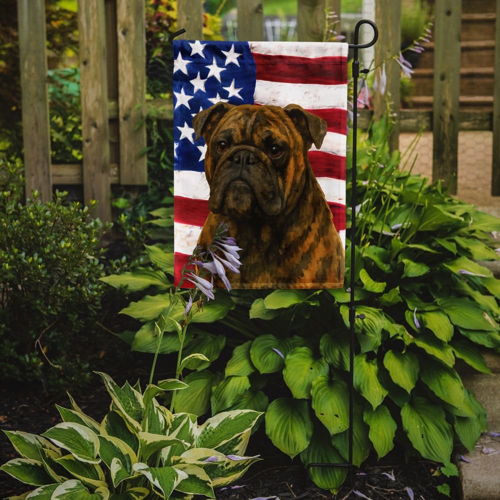 Garden Flag featuring breed specific English Bulldog artwork. Enhance the beauty of your garden, patio, or yard with Caroline's Treasures Decorative Garden Flag, proudly made in the USA. Crafted from two pieces of thick, double-sided polyester fabric, this 2-ply garden flag is designed to withstand various weather conditions, making it water-resistant and weatherproof. Featuring correctly readable words on both sides, this garden flag offers a delightful visual experience from any angle. With its heavier weight, it stands out among other garden flags, ensuring stability and durability even in wind, rain, and snow. Measuring approximately 11 1/4 inches by 15 1/2 inches, this flag allows you to personalize your outdoor decor. It comes with a 1 1/2-inch sleeve sewn in, allowing easy attachment to any standard garden flag stand or garden size porch hanger (sold separately). Make a statement in your outdoor space with Caroline's Treasures Decorative Garden Flag, a vibrant and high-quality flag that adds color and personality to your surroundings. Proudly made in the USA, it's a symbol of quality craftsmanship and attention to detail.