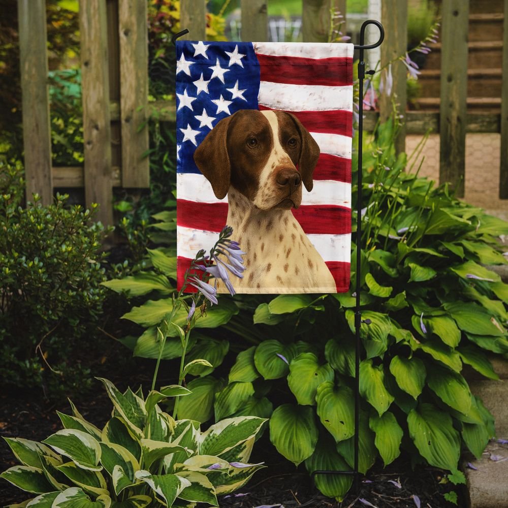 Garden Flag featuring breed specific Pointer artwork. Enhance the beauty of your garden, patio, or yard with Caroline's Treasures Decorative Garden Flag, proudly made in the USA. Crafted from two pieces of thick, double-sided polyester fabric, this 2-ply garden flag is designed to withstand various weather conditions, making it water-resistant and weatherproof. Featuring correctly readable words on both sides, this garden flag offers a delightful visual experience from any angle. With its heavier weight, it stands out among other garden flags, ensuring stability and durability even in wind, rain, and snow. Measuring approximately 11 1/4 inches by 15 1/2 inches, this flag allows you to personalize your outdoor decor. It comes with a 1 1/2-inch sleeve sewn in, allowing easy attachment to any standard garden flag stand or garden size porch hanger (sold separately). Make a statement in your outdoor space with Caroline's Treasures Decorative Garden Flag, a vibrant and high-quality flag that adds color and personality to your surroundings. Proudly made in the USA, it's a symbol of quality craftsmanship and attention to detail.