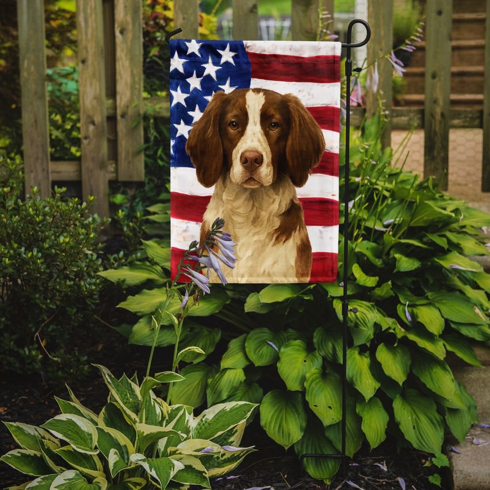 Garden Flag featuring breed specific Brittany artwork. Enhance the beauty of your garden, patio, or yard with Caroline's Treasures Decorative Garden Flag, proudly made in the USA. Crafted from two pieces of thick, double-sided polyester fabric, this 2-ply garden flag is designed to withstand various weather conditions, making it water-resistant and weatherproof. Featuring correctly readable words on both sides, this garden flag offers a delightful visual experience from any angle. With its heavier weight, it stands out among other garden flags, ensuring stability and durability even in wind, rain, and snow. Measuring approximately 11 1/4 inches by 15 1/2 inches, this flag allows you to personalize your outdoor decor. It comes with a 1 1/2-inch sleeve sewn in, allowing easy attachment to any standard garden flag stand or garden size porch hanger (sold separately). Make a statement in your outdoor space with Caroline's Treasures Decorative Garden Flag, a vibrant and high-quality flag that adds color and personality to your surroundings. Proudly made in the USA, it's a symbol of quality craftsmanship and attention to detail.
