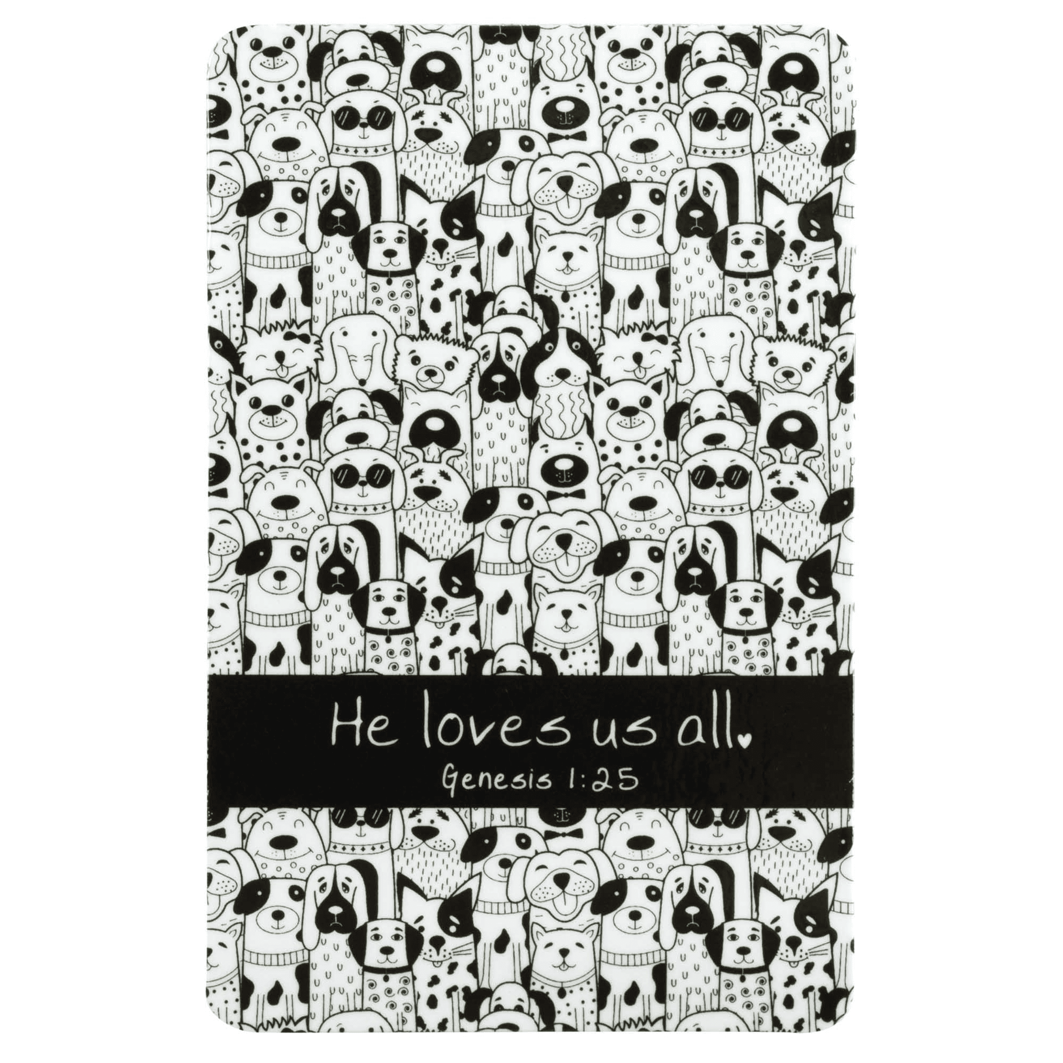 Pocketcard Style Bookmark Features Genesis 1:25 Over A Dog Patterned Background: He Loves Us All. To And From Spaces On White Back For Personalization. The Card Stock Is Clear Laminated For Extra Durability. Size Of Bookmark Is 2.5 x 3 7/8.